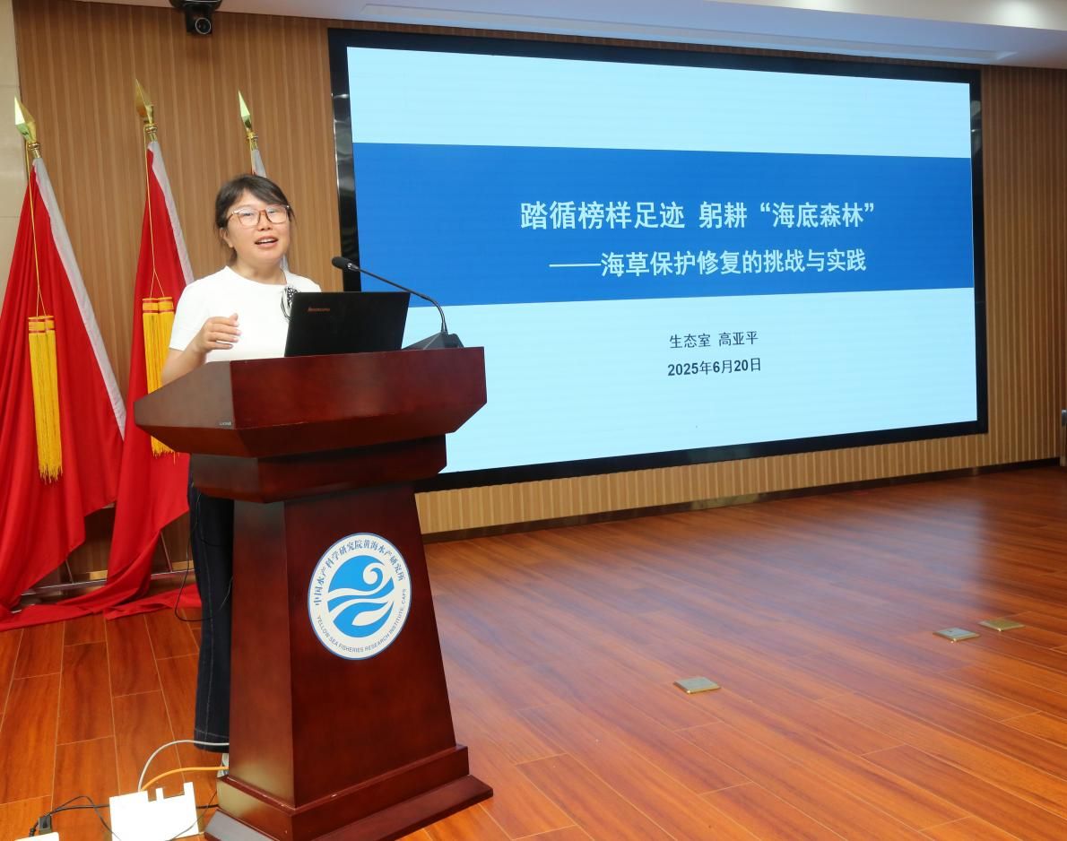 思政课邀请李亚男、安力、王新良、高亚平等四位青年职工结合各自工作分别作了题为《丹心映碧海 创新济沧?!焓髌量萍急ü木衩苈搿贰逗胙锖Q罂蒲Ъ揖?赓续海洋家国情怀》《志存高远、脚踏实地、行循自然——极地渔业科研感悟》《踏循榜样足迹 躬耕“海底森林”——海草?;ば薷吹奶粽接胧导沸脖ǜ?。