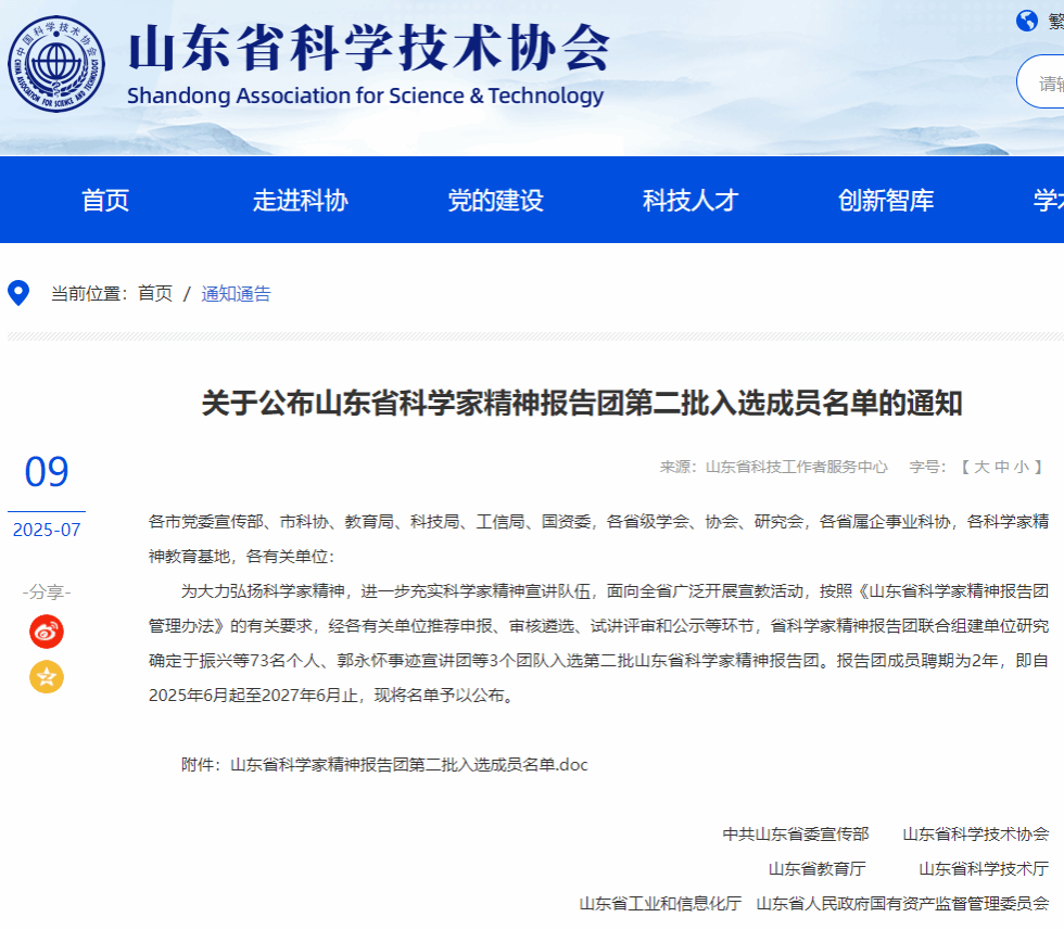 此次遴选,按照《山东省科学家精神报告团管理办法》有关要求,经各有关单位推荐申报、审核遴选、试讲评审和公示等环节,省科学家精神报告团联合组建单位研究确定了73名个人和3个团队入选第二批山东省科学家精神报告团,聘期2年,旨在大力弘扬科学家精神,充实科学家精神宣讲队伍,面向全省广泛开展宣教活动。