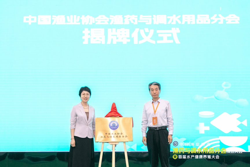 中国渔业协会会长崔利锋和分会会长李清共同为渔药与调水用品分会揭牌