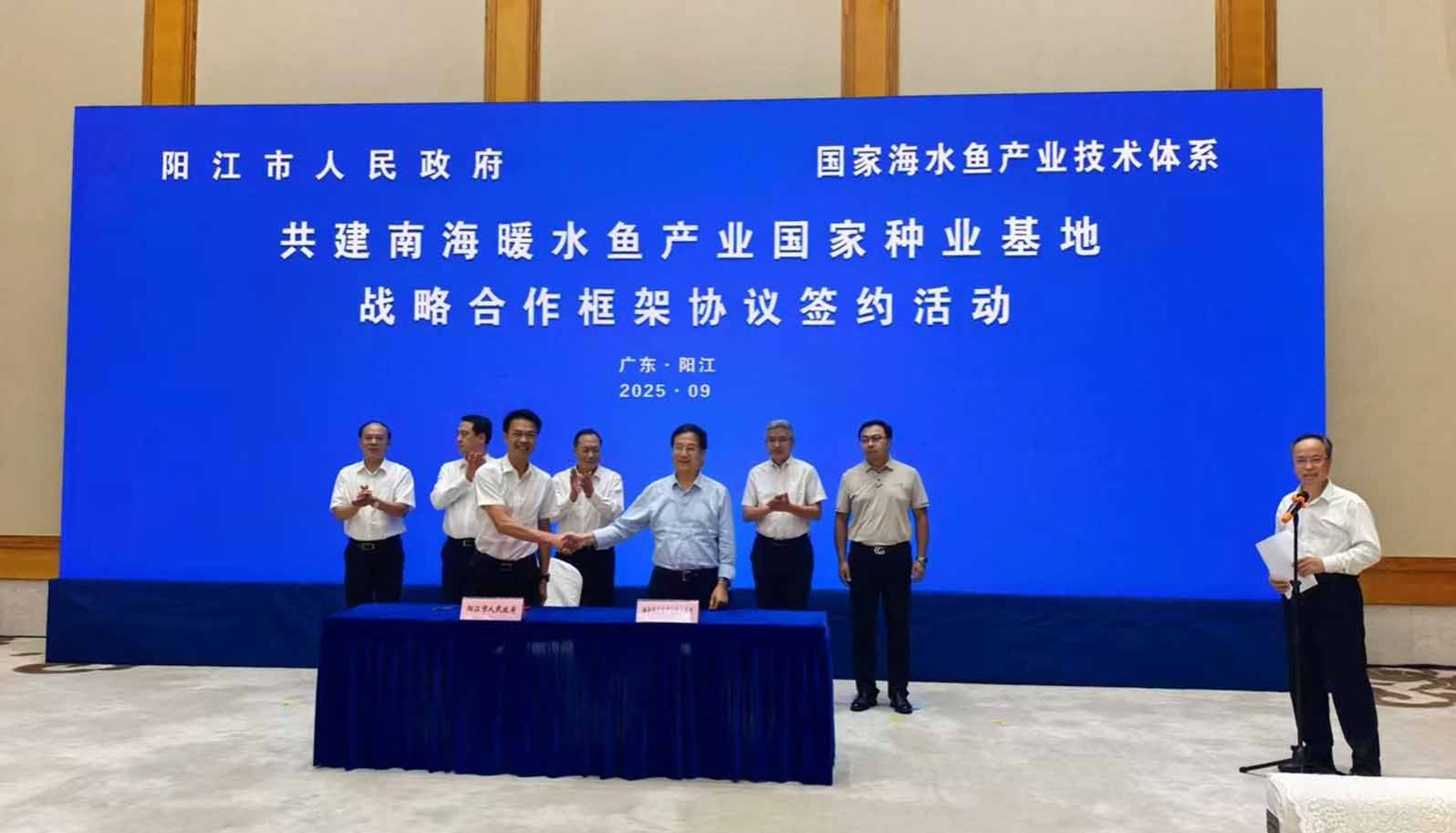 阳江市副市长关天表与陈松林院士分别代表阳江市人民政府和体系签署了《共建南海暖水鱼产业国家种业基地战略合作框架协议》,双方将秉承“优势互补、协同创新、产业发展、合作共赢”的原则,合作开展南海暖水鱼种质资源收集与评价、性状解析和优异基因资源发掘、新品种创制、苗种规?;庇瓤萍即葱卵蟹?,建立育繁推一体化种业体系,支撑建设南海暖水鱼产业国家种业基地,携手打造国家级种业科技创新与示范高地,支撑阳江市海水鱼养殖产业和海洋牧场高质量发展。