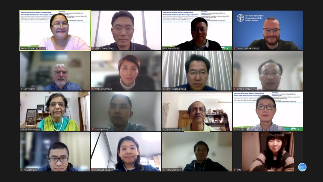 12月20日至21日,由中国水产科学研究院黄海水产研究所主办,联合国粮食及农业组织(FAO)、美国密西西比州立大学、印度尼特大学和中国水产科学研究院珠江水产研究所协办的FAO国际水产养殖耐药(AMR)与生物安保学术研讨会以远程视频会议的形式召开。FAO水产养殖处官员Melba Reantaso博士、郝彬博士,黄海水产研究所金显仕所长、王印庚研究员,美国密西西比州立大学Patricia Gaunt教授,印度尼特大学Karunasagar Indrani教授,珠江水产研究所王庆研究员,各参考中心的主要成员,以及来自欧洲、美洲、非洲、亚洲的50多个国家和世界动物卫生组织(OIE)、亚太水产养殖中心网(NACA)等国际组织的500余人参加了会议。会议由Melba博士、Patricia Gaunt教授、Karunasagar Indrani教授和王印庚研究员轮流主持。