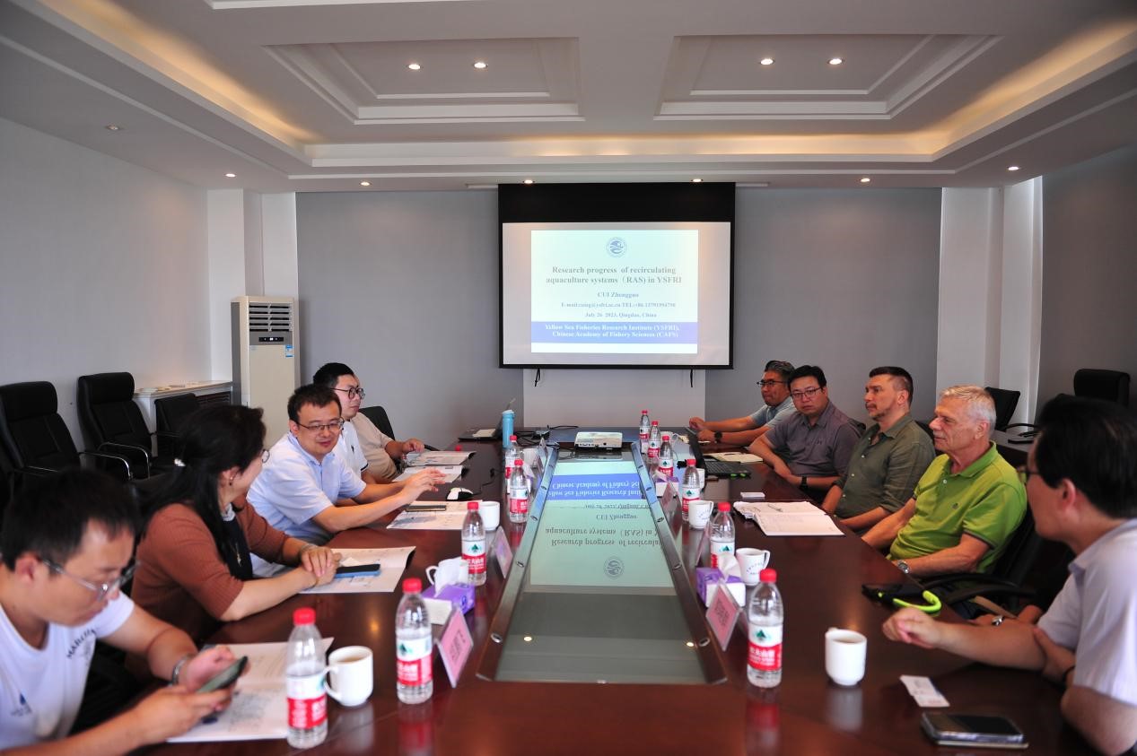 崔正国研究员对希思迪访问团来所交流访问表示欢迎,简要介绍了黄海水产研究所历史沿革、成果产出和平台建设等方面的基本情况,并做题为“Research progress of recirculating aquaculture systems(RAS) in YSFRI”的报告。报告详细介绍了中国工厂化养殖发展历程以及黄海水产研究所相关领域研究成果。