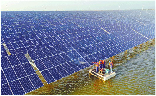 滨州市沾化区通汇30万千瓦“渔光一体”项目占地9000余亩,充分利用立体空间,融合光能、海水等要素,配合风机和盐田,形成了“上光中风下渔底盐”的发展模式,实现蓝色产业绿色转型。目前,该项目总装机量300兆瓦,年可发电4.2亿度,年产“盐田虾”200吨、产值约1400万元。
