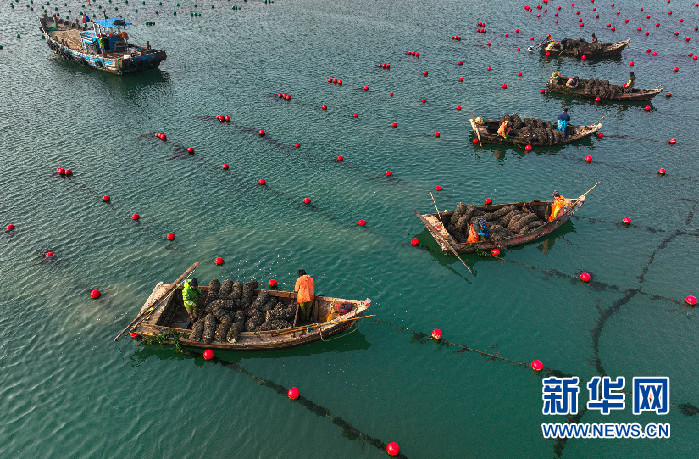 日前,在山东省荣成市爱伦湾海域海上养殖区,渔民们驾驶舢舨穿行在多彩养殖浮漂间进行贝类养殖作业。新华网发(李信君摄)