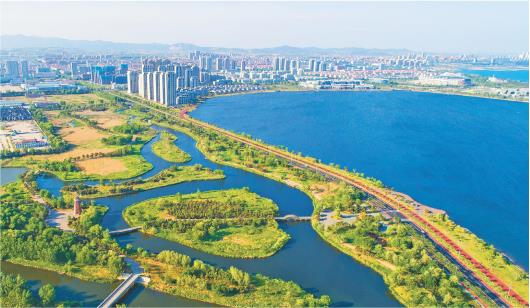 近日,位于胶东半岛最东端的荣成市桑沟湾湿地公园绿意盎然,与滨海小城交相辉映,景美如画。