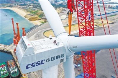 工程人员登上完成总装的“扶摇号”发电机组顶部,准备进行解除吊缆作业(5月27日摄,无人机照片)。