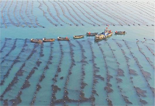 目前正值荣成市各大海洋牧场贝类、藻类养殖的管护期,渔民们驾驶渔船在养殖区来往穿梭,进行更换浮漂、投喂饵料等作业,一派海上春耕繁忙景象。