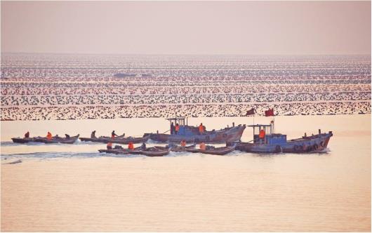 2月4日,荣成市一家海洋牧场,渔民驾驶养殖船出海作业。