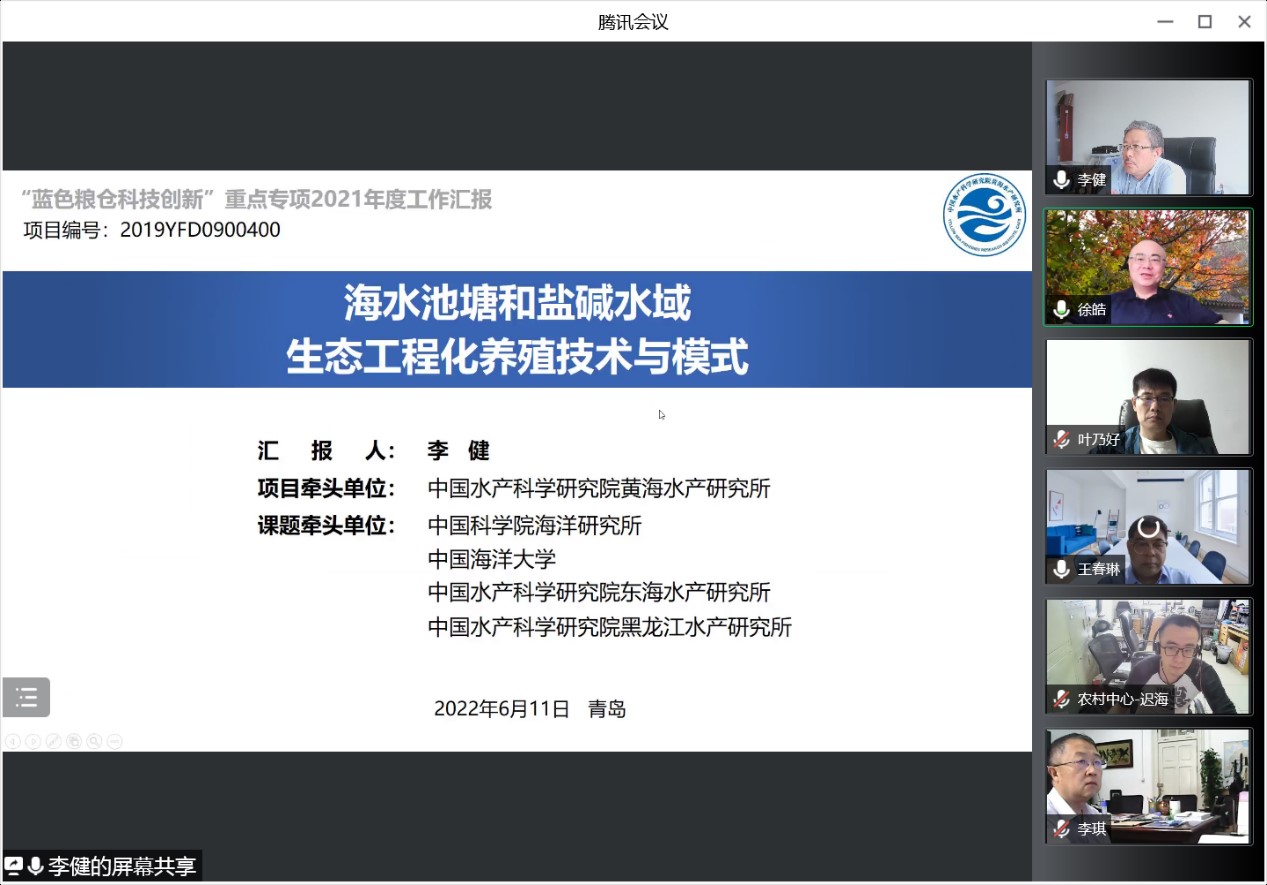 6月11日,中国水产科学研究院黄海水产研究所牵头承担的国家重点研发计划“蓝色粮仓科技创新”重点专项“海水池塘和盐碱水域生态工程化养殖技术与模式”2021年度总结与工作推进会以视频会议形式召开。项目咨询专家组由中国水产科学研究院渔业机械仪器研究所徐皓研究员、中国科学院海洋研究所杨红生研究员、宁波大学王春琳教授、中国科学院烟台海岸带研究所吕剑研究员、中国科学院海洋研究所张国范研究员、上海海洋大学李家乐教授、中国海洋大学李琪教授和宋协法教授组成,科技部中国农村技术开发中心项目专员迟海与会指导。项目牵头单位及项目负责人、课题负责人、项目组成员等60余人参加了本次会议。