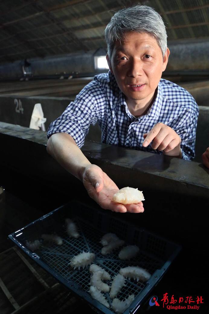 日前,记者随陈四清来到位于崂山区王哥庄街道青山社区的一家水产养殖公司,这里有岛城唯一一处规?;嘲缀2蔚纳锨椒矫壮Х?。每年的繁殖关键期,陈四清都会在这里住将近两个月,一年也会来将近十次,指导厂里的技术员提高白海参的生长质量。