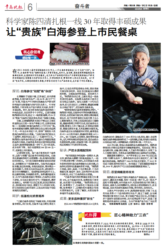 长期辗转于福建宁德、江苏宿迁、省内青烟威等地,扎根科研和生产一线30年,致力于“三农”发展,中国水产科学研究院黄海水产研究所珍稀海洋生物繁殖与?;ね哦痈涸鹑?、科学家陈四清,不断实现水产品科研攻关突破,取得了丰硕成果。