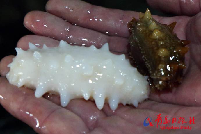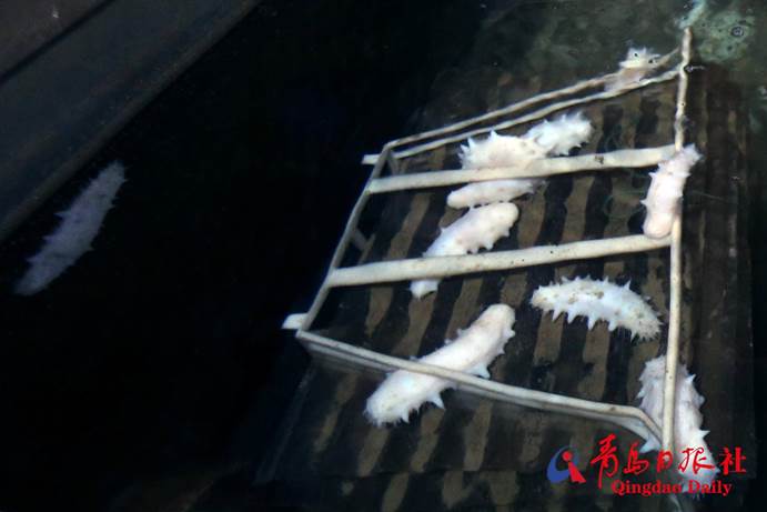 “之前白海参在附近下海做实验,但是回捕量非常低。我们发现,白海参不适合野生养在大海中,它在自然界是很难生存的,很容易被天敌发现后吃掉,而且当它鼓起身体漂浮的时候,会被海浪冲得很远,甚至消失不见。”陈四清告诉记者,之前发现过一些鱼类喜欢吃海参,比如黑头鱼的肚子剖开之后发现过白海参;海鸟从海里一口叼住白海参,把它扔到岩石上用嘴啄;霸道的螃蟹也会伸出“钳子”,把白海参当做美食。