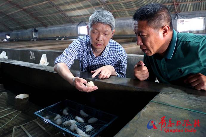 陈四清(左)指导养殖厂里的技术员如何提高白海参的生长质量。