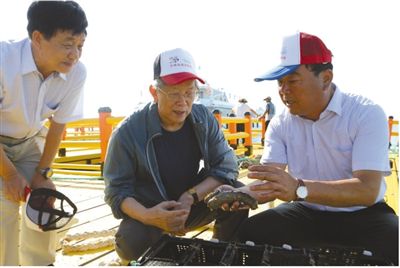 唐启升(中)考察山东省荣成市东楮岛海洋牧场与休闲渔业。