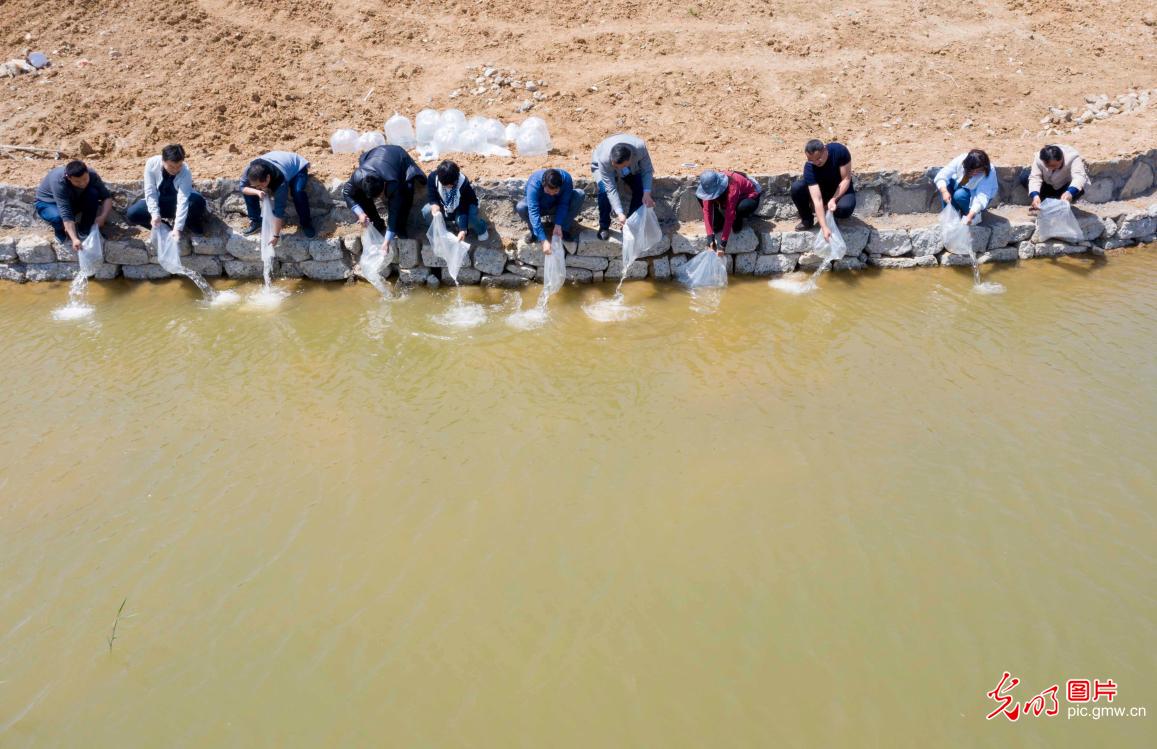 2021年5月5日,中国水产科学研究院黄海水产研究所的科研人员,在山东青岛西海岸新区知山乐禾新田园公社,把2000尾崂山仙胎鱼(学名香鱼)鱼苗投放到园区的水系之中。崂山仙胎鱼是一种珍稀淡水鱼,有"崂山中华鲟"之美誉。(韩加君摄/光明图片)