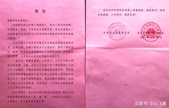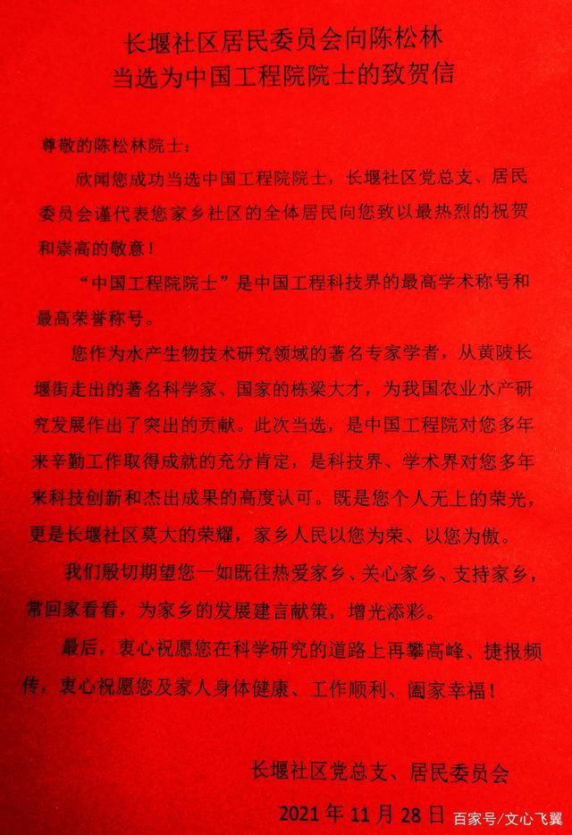 2021年11月28日武汉黄陂家乡祝贺陈松林当选中国工程院院士,陈院士回复:“当选院士更多的是一份责任,现在赶上我们国家打好种业‘翻身仗’的大好时机,让我感觉到今后肩上的担子更重了。同时感恩家乡父老的关爱,并尽力反馈家乡!”陈松林博士是破译我国首个鱼类基因组的中国水产科学研究院水产生物技术领域首席科学家。我们相识的机缘是经其姐夫胡炳基先生介绍,后将其主要成果收入《黄陂春秋﹒人物卷》《无陂不成镇》人物卷