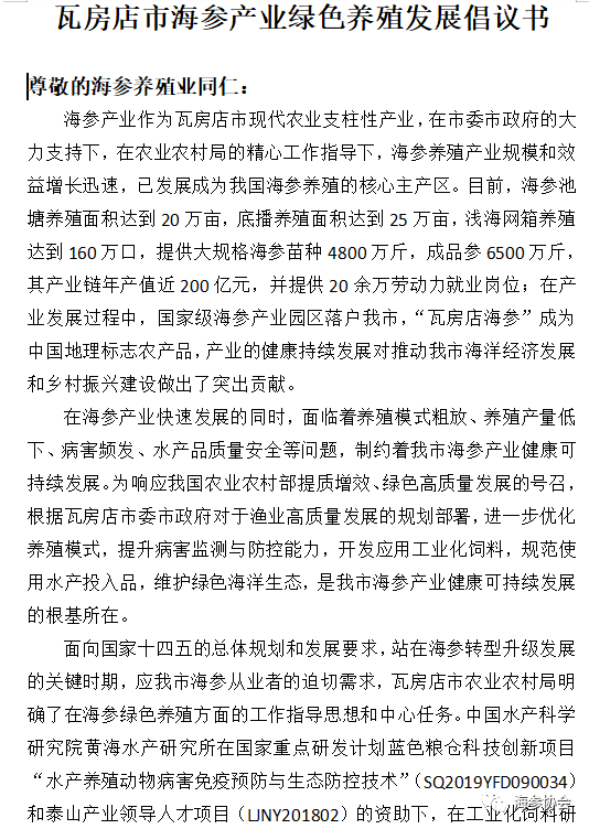 2月28日,由中国水产科学研究所、瓦房店市农业农村局、瓦房店市海参协会、大连旭笙海产有限公司、中科蓝海(大连)生物科技有限公司等多家涉海养殖单位,在位于辽刺参主产区的瓦房店市谢屯镇沙山村的旭笙海产公司共同发起倡议,实施中国水产科学研究院黄海水产研究所重点研发“蓝色粮仓”科技创新项目“水产养殖动物病害免疫预防与生态防控技术”(sq2019yfd090034)和泰山产业领导人才项目(LjNY201802)下的工业化饲料研制和病害专用药物研发,以科学投喂和规范用药引领传统海参养殖模式的转型升级,从海洋生态安全和水产品质量安全的高度,倡导“绿色养殖,生态先行”的养殖新模式,以科学手段和技术支撑,促进辽刺参主产区养殖业转型升级,提质增效。
