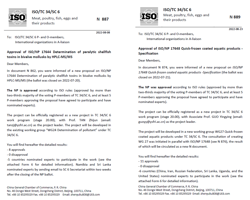 据介绍,《双壳贝类中麻痹性贝类毒素(PSTs)的测定 液相色谱-串联质谱法》是我国在水产品生物毒素检测领域牵头制定的第一项国际标准,也将是全球范围内首个建立的科学规范的双壳贝类中麻痹性贝类毒素检测技术,可以满足国际上日渐认同的化学法检测及评价的发展趋势,并确保相关工作在全球范围内统一、规范;《速冻裹衣水产制品》是针对风靡全球的速冻调理水产品制定国际标准,能够有效规范国际贸易行为,推动世界食品的多样化、方便化、组合化的发展。