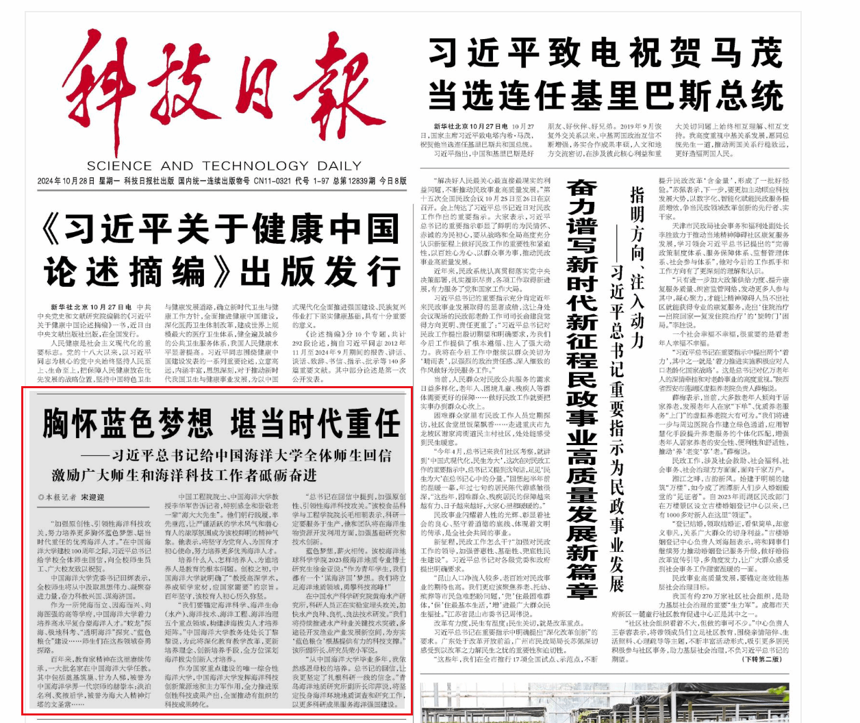 中国海洋大学党委书记田辉表示,全校师生将从中汲取思想伟力、凝聚奋进力量,奋力科教兴国、谋海济国。