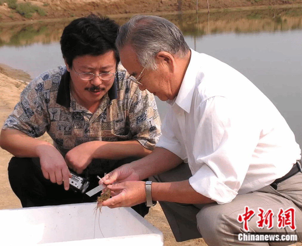 图片赵法箴(右)测量对虾。黄海水产研究所供图