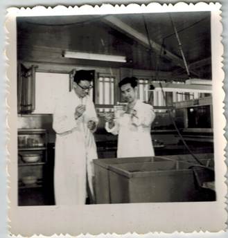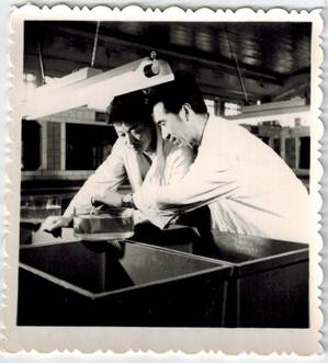 1970-1971年期间,与王者茂先生一起研究牙鲆繁育(右一)