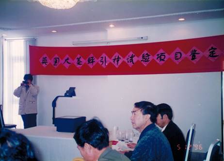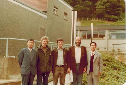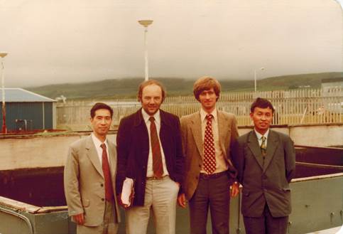 1980年,参观英国亨特斯度原子能发电厂外的温水养鱼场合影(左一)